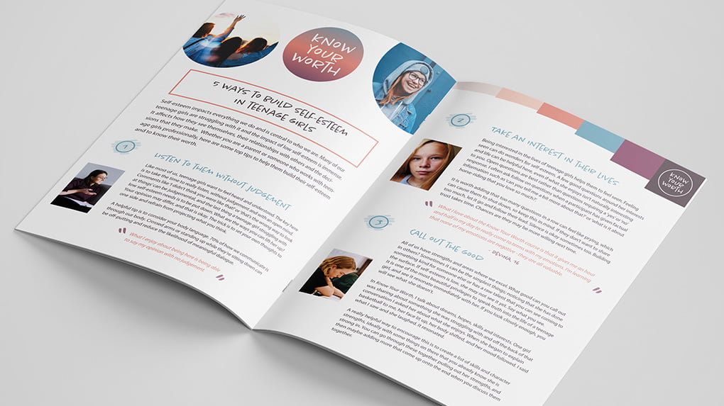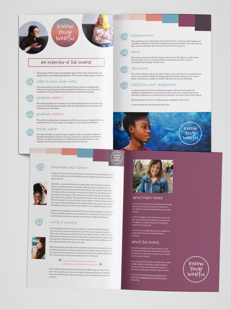 Self-esteem impacts everything we do and is central to who we are. Many teenage girls struggle with low self-esteem and the impact is immense. We were delighted to help Debs Peake create branding for Know Your Worth and help create marketing materials to promote an 8-week course to help teenage girls build self-esteem and make good decisions.