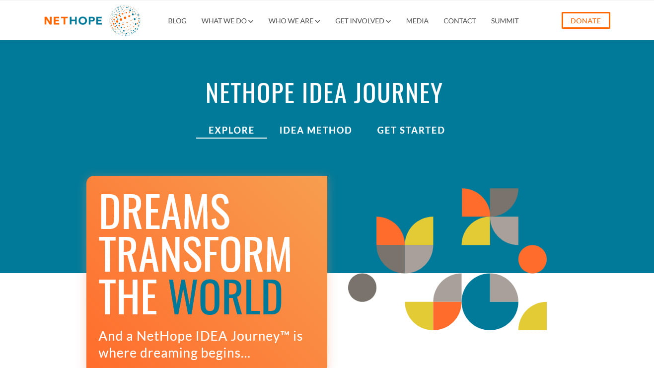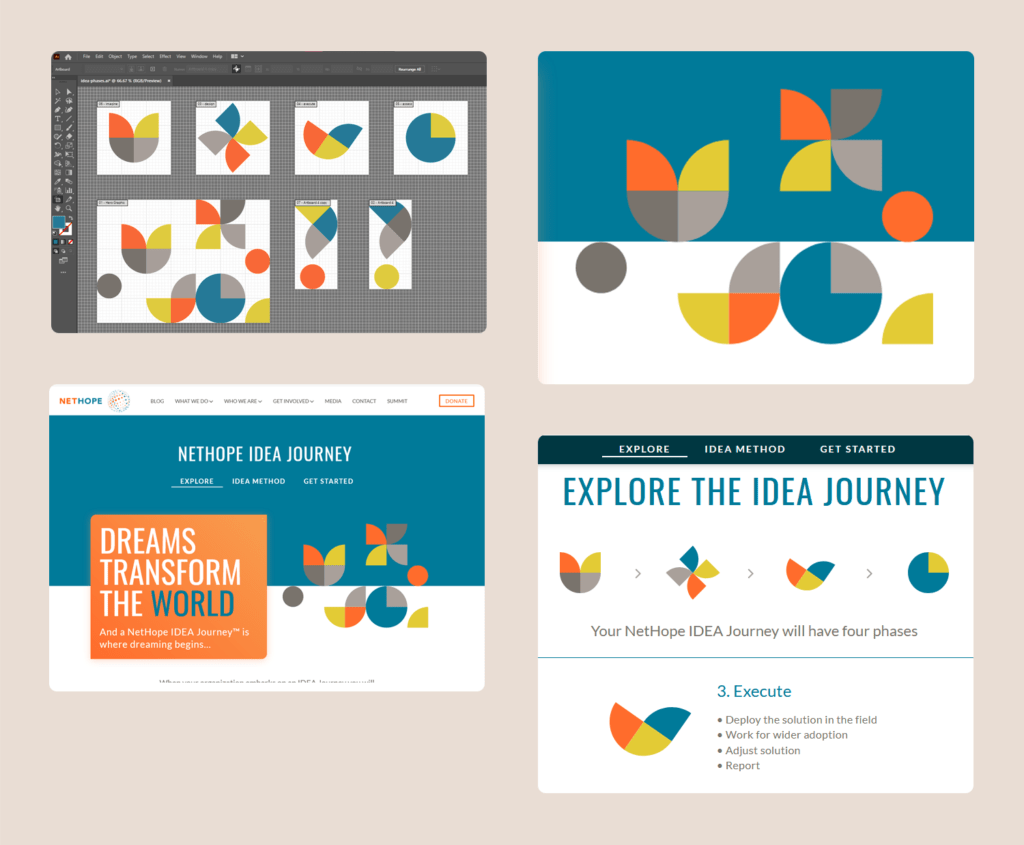 We took NetHope's brand guidelines (fonts and colour palette) and created bold sections to inspire nonprofits to take the IDEA Journey. At the centre of the redesign was an abstract representation of the 4 steps (Imagine, Design, Execute, Assess). NetHope wanted a big change on their previous diagram, which had icons which looked dated and mechanical. We chose a very minimalistic shape - the quadrant and the four NetHope colours and arranged these on a grid to create 4 icons that form shapes that meaning can be added. These shapes were then arranged in a pattern at the top of the homepage and then used as a motif throughout.